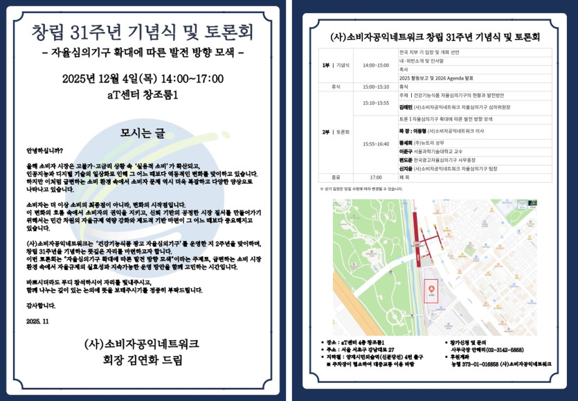 제목 (사)소비자공익네트워크 창립 31주년 기념식 및 토론회 행사 안내 작성일 2025-11-20